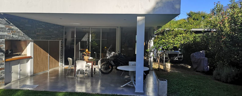 Jardín de entrada con rejas, portón automático, cochera doble, patio de césped, galería con asador, cocina - comedor, lavadero, living - comedor - toilette.